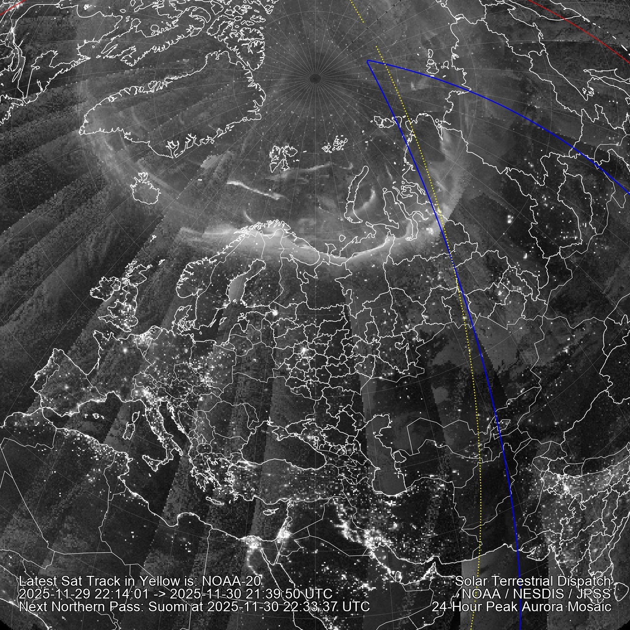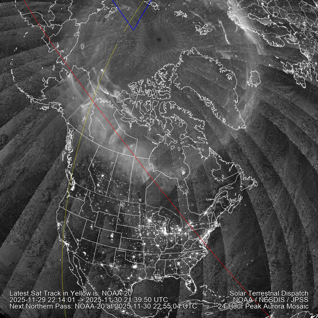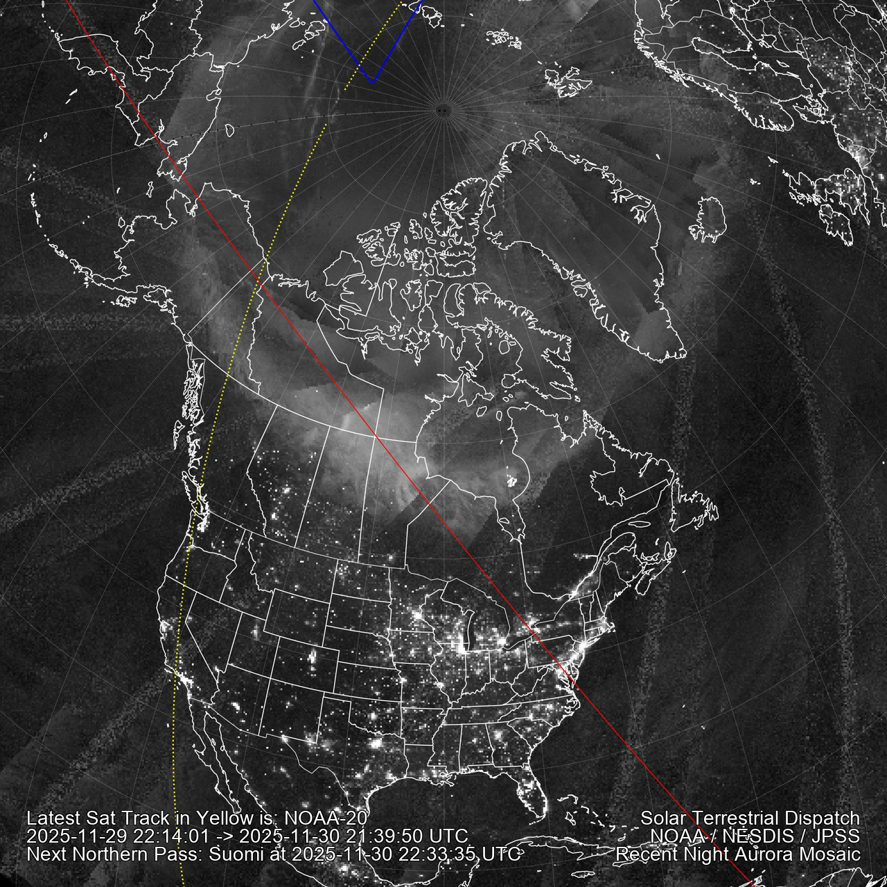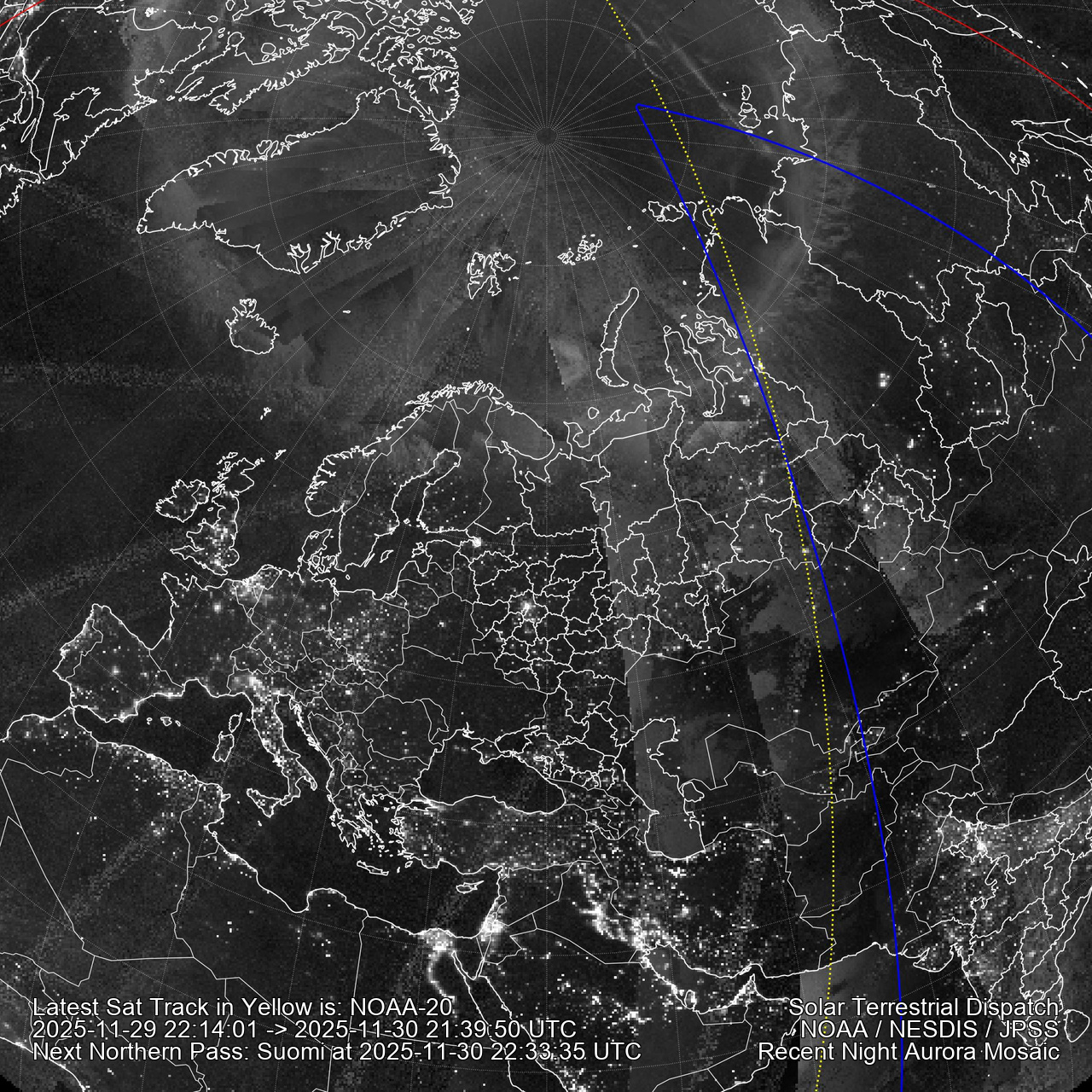 Click Here for a quick visual tutorial. Aurora mosaics are created from all three polar passes of the NOAA-21/20/Suomi spacecraft. Data comes in strips. The red line marks where the sun is rising or setting at the time stamp of the latest data (marked after ->). The area inside the blue line marks darkness and no lunar interference (the moon has not risen). The dotted yellow line shows the center of the latest satellite pass so it is easy to tell which swath is the current one. City lights are visible. Click here for Southern hemisphere polar images.
