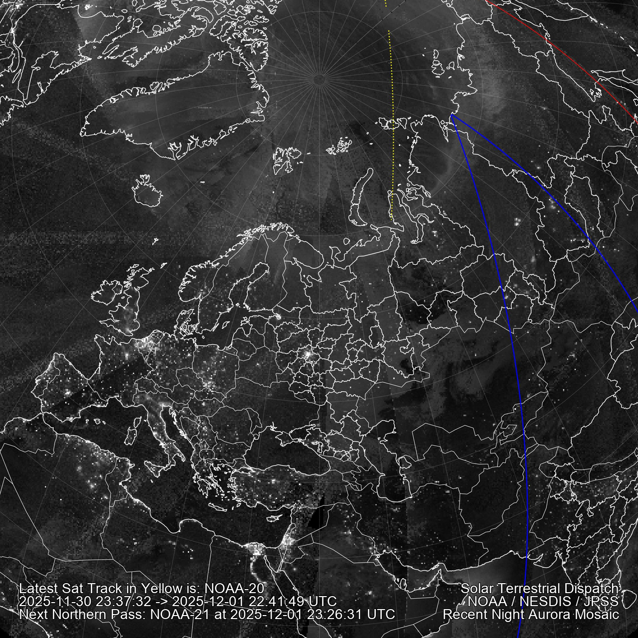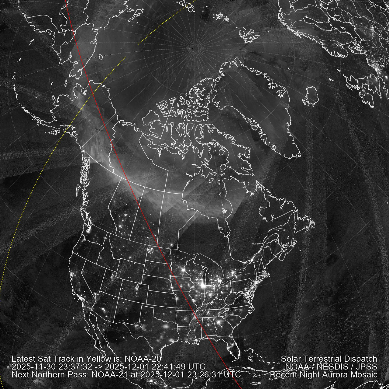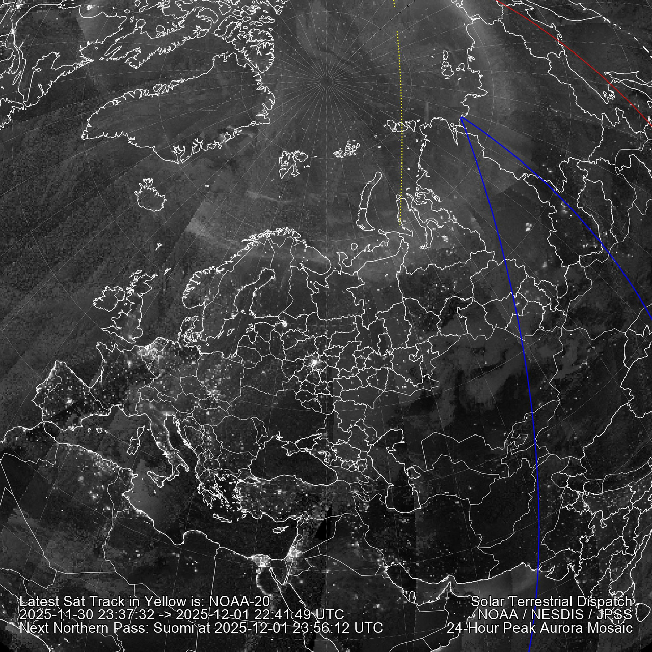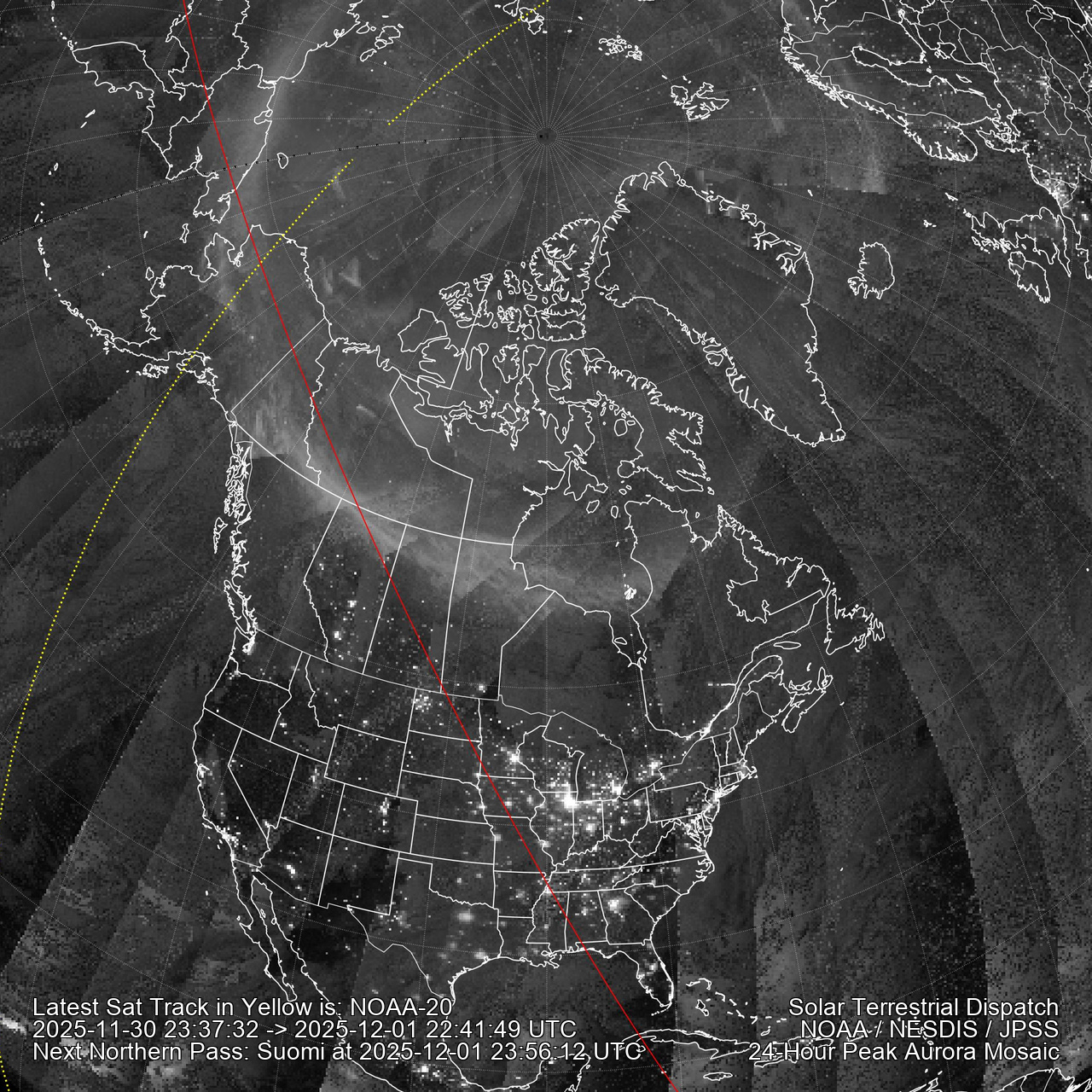 Click Here for a quick visual tutorial. Aurora mosaics are created from all three polar passes of the NOAA-21/20/Suomi spacecraft. Data comes in strips. The red line marks where the sun is rising or setting at the time stamp of the latest data (marked after ->). The area inside the blue line marks darkness and no lunar interference (the moon has not risen). The dotted yellow line shows the center of the latest satellite pass so it is easy to tell which swath is the current one. City lights are visible. Click here for Southern hemisphere polar images.